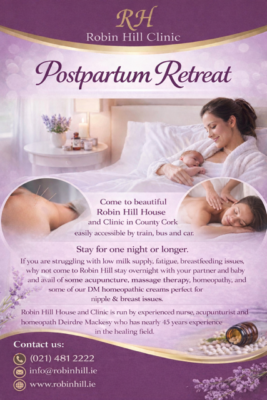 This whole concept of postpartum retreats was given to me by a special lady, an excellent Lactation consultant from the Midlands in Ireland Patricia Martenson. Patricia has been a great supporter of The homeopathic Breast cream also… which is available to purchase here at Robin Hill Clinic. So Thank you Patricia.